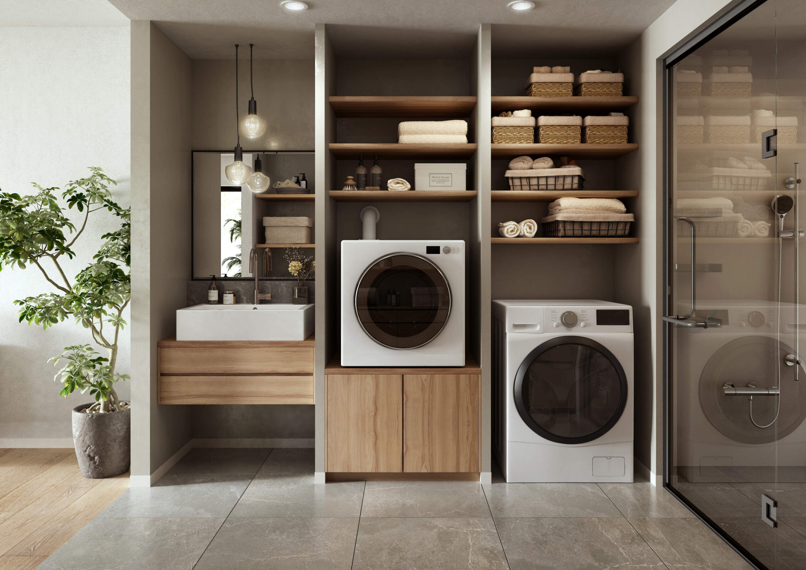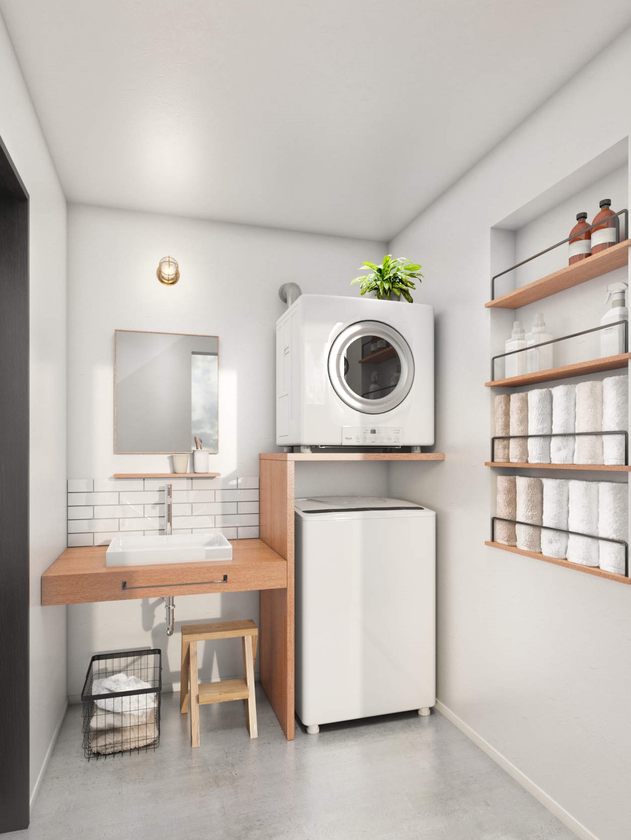「乾太くん、室内に置くスペースがなさそう。」そんな不安をお持ちの方におすすめなのが、造作棚で乾太くんを好きなデザインで縦置き設置することです!